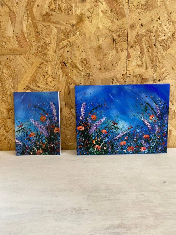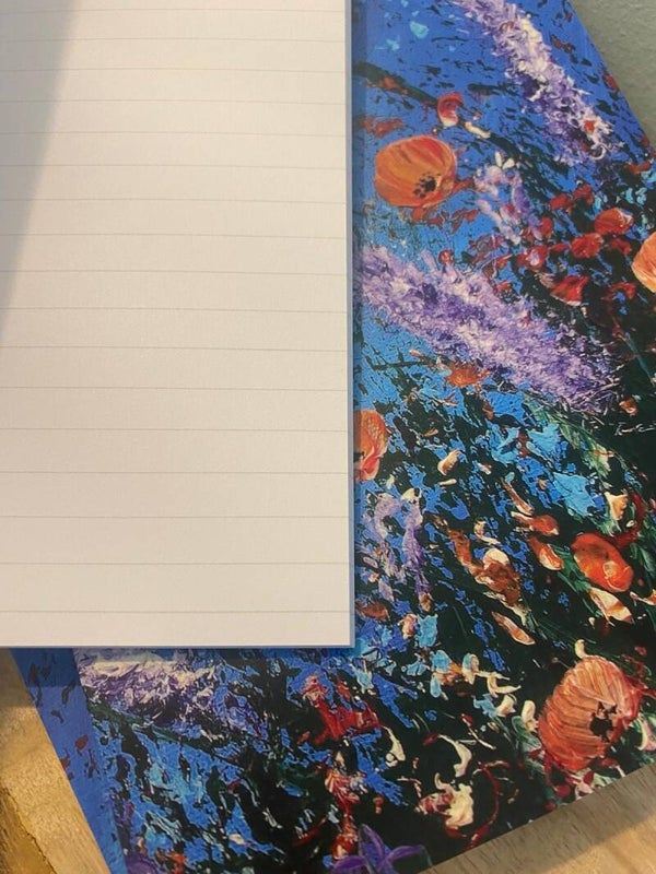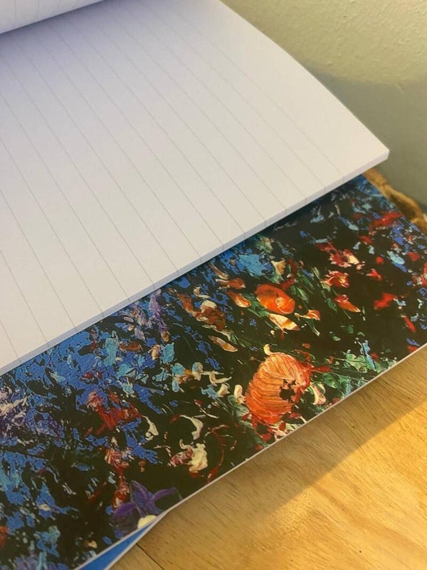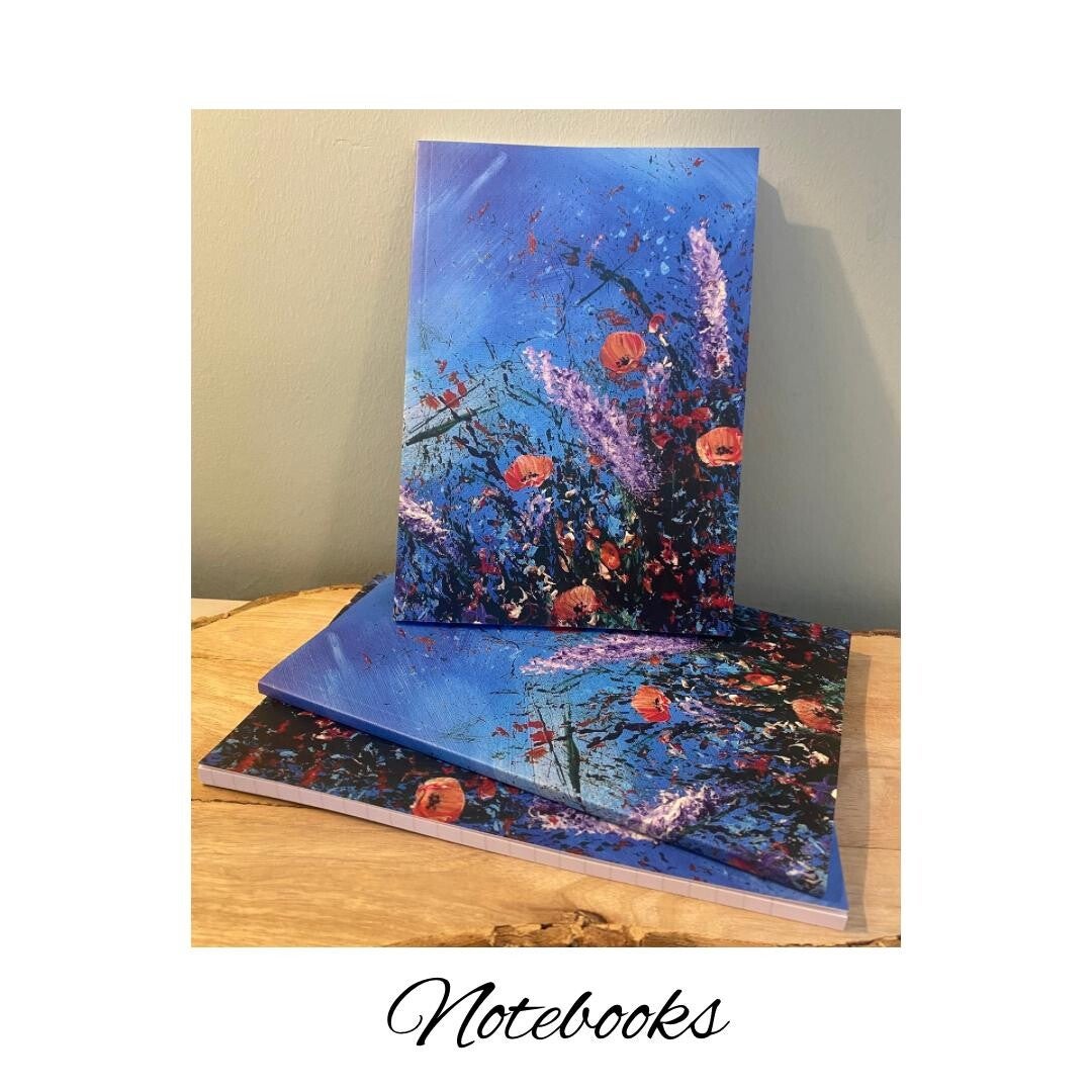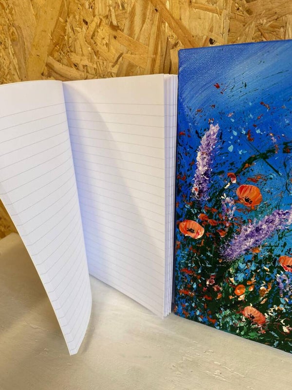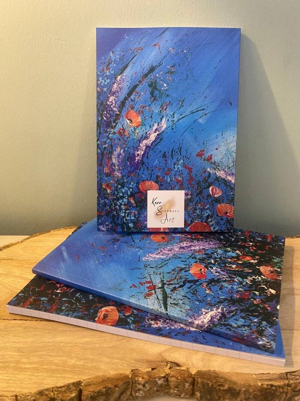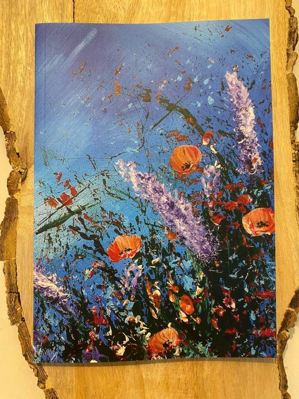 Step into a dreamscape of bold blues and flowing petals with this A5 notebook, featuring the artwork Midsummer Poppies — a serene and expressive original acrylic painting. The cover captures the quiet magic of wild poppies swaying under a midsummer sky, reimagined in cool, calming hues that invite reflection and creativity.