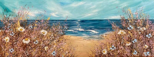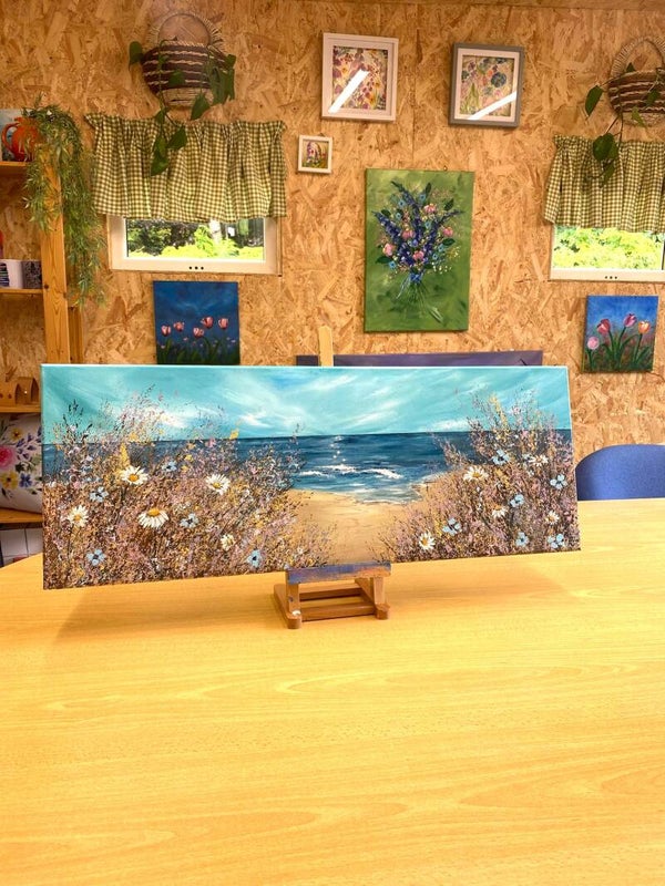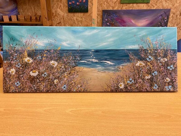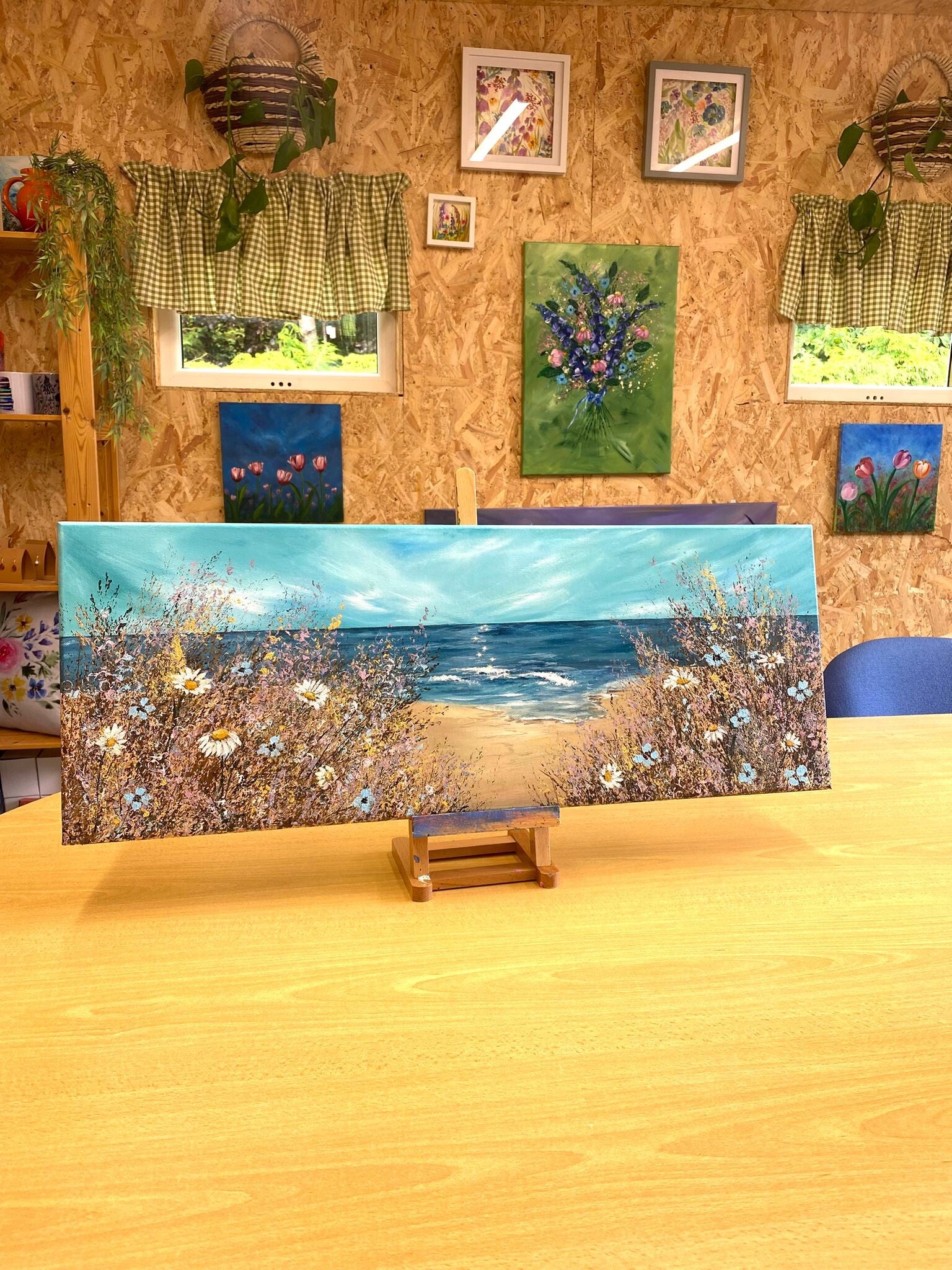 Join us for an immersive and inspiring day workshop where you’ll create a large, panoramic acrylic painting (1 meter x 30 cm) blending the beauty of sea, sand, and floral detail. This workshop is designed to guide you through the process gently.